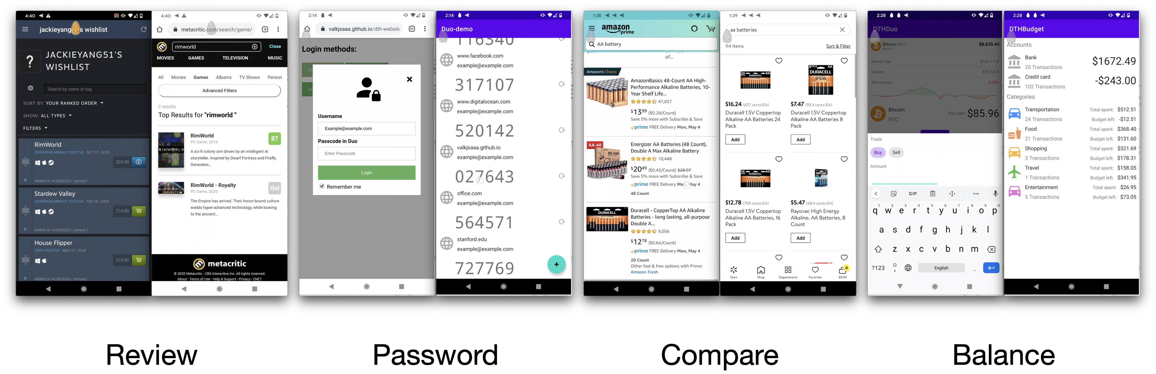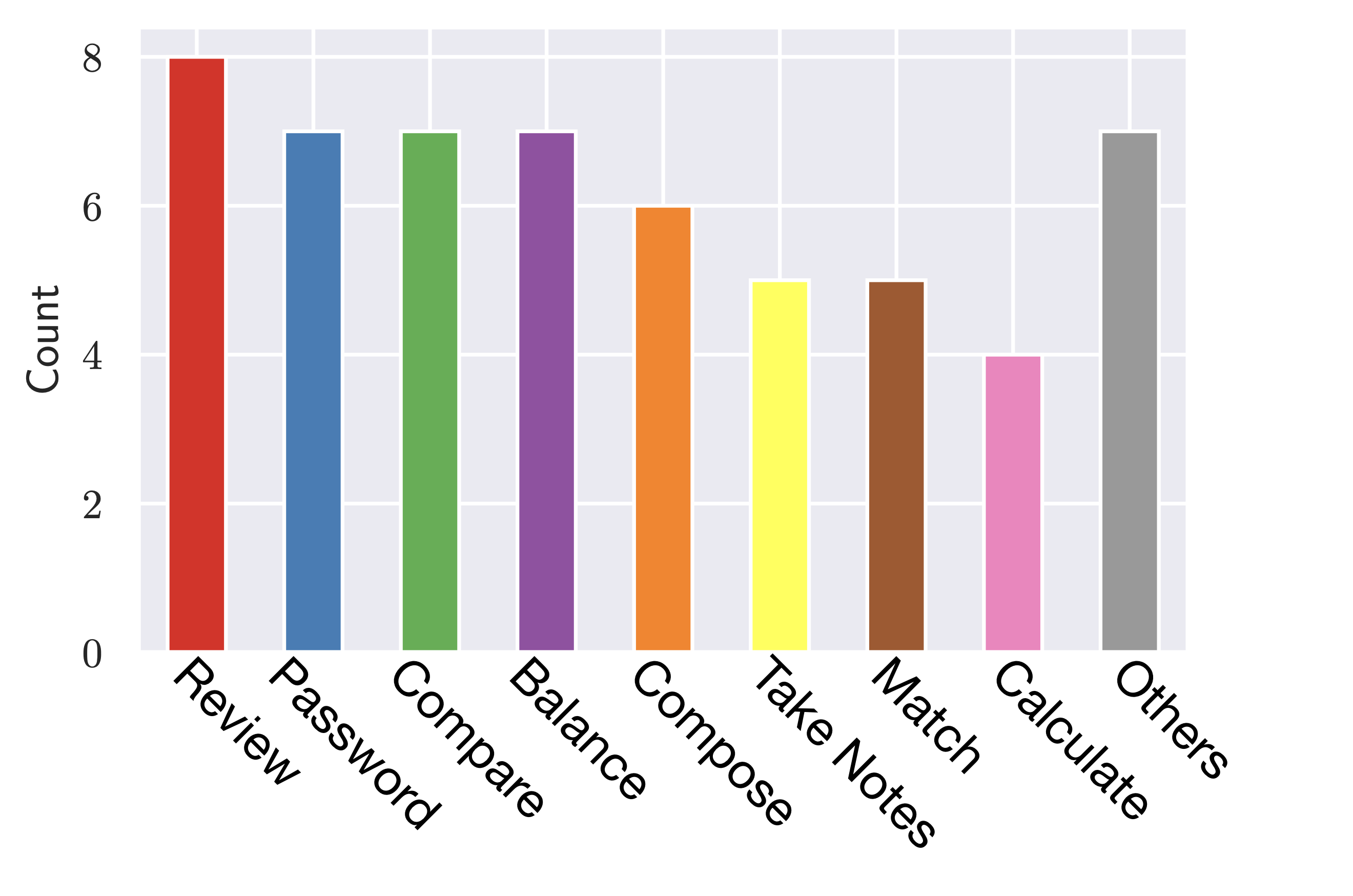 Among these cross-app tasks, we found the core problem is data exchange between apps. We identified two types of data exchange: simple data exchange (copy-and-paste on the desktop, e.g., review, password, and balance) and complex data exchange (looking at and interpreting the information from one app while working on another, e.g., compare).
