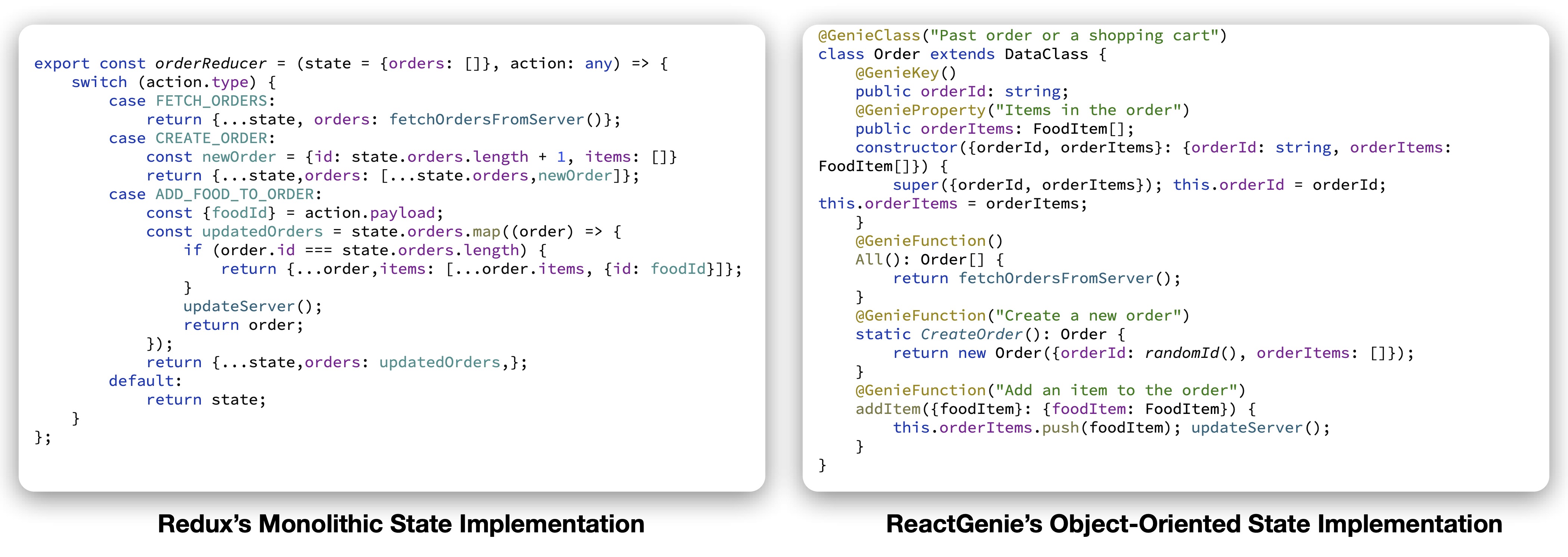 To address these challenges, we present ReactGenie, a programming framework that uses an object-oriented state abstraction approach to seamlessly support building complex multimodal mobile applications. ReactGenie enables developers to define both the content and actions in an app and automatically handles the natural language understanding and composition of different modalities by generating a parser that leverages large language models (LLMs).